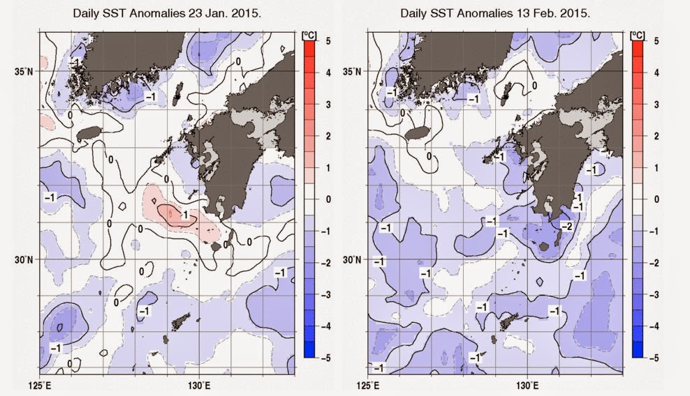こんな感じです(クリックで拡大). 左が各地で良い釣果が効かれていた1月下旬,右が釣果がよくない情報が多かった2月中旬です.3週間ぐらいで1〜3度も水温が落ちていることがわかると思います.