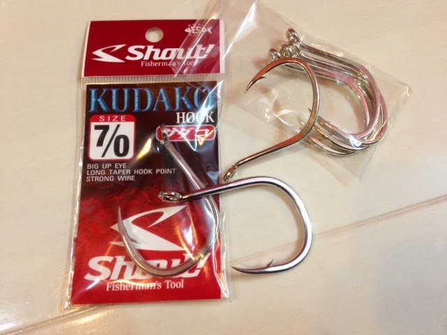 今のところ私がメインで使っているのはソルティガのジギングフック5/0とシャウトさんのクダコ5/0と7/0です.あとは場合によってがまかつさんの貫石鯛18号~20号を使います.