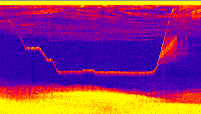 ちなみに,上の画像は潮下から魚群までのアプローチ,下が潮上から釣りをしているところなので,ボトムの形状が逆になってます.