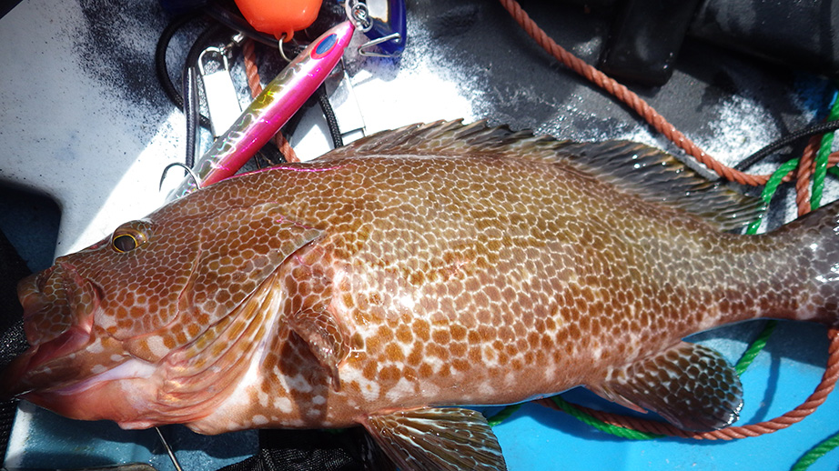 ベタゾコ,ハタっぽい引きです.,オオモンは釣ったから,他のハタがいいなぁーと思っていたら,上がってきたのはキジハタ.アコウです.これも嬉しいハタですね.