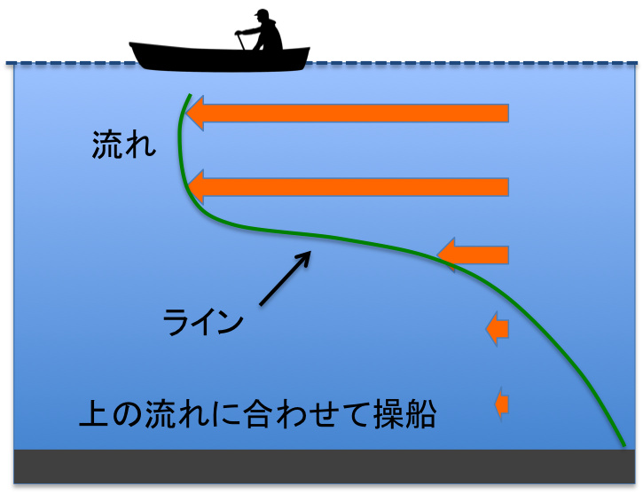 ま,この作業は最初の1流し2流しで,船頭さんが底潮の流れる向きや速さが分かってくれば,最初から底潮に合わせてアプローチされます.それでも最初は少しラインを船から離しておいたほうが立てやすいので,ラインは少しだけ船から離れます.また,最初から底潮に合わせてアプローチしているので,かなりたるみができます.