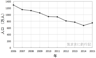ここ9年のデータですが,なんと!喜ばしいことに2015年,このグラフの中では初めて釣り人口が増加しました!!!!