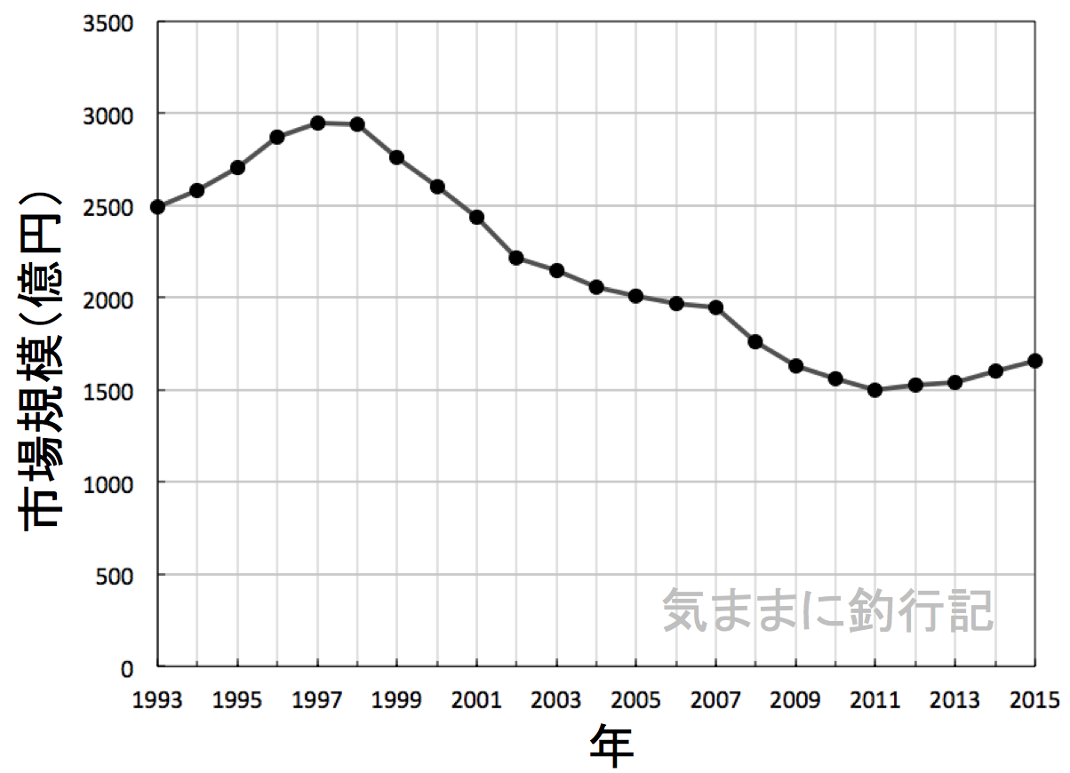 どうでしょうか?釣り業界の市場規模グラフと似たような形ではありませんか?