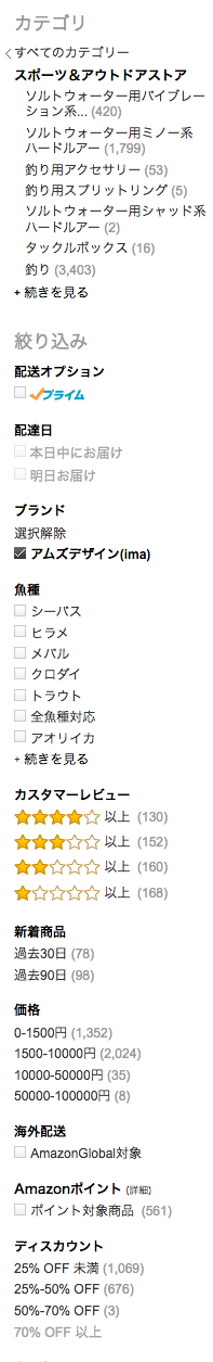 すると?絞込の欄に今まで現れていなかった定価から何%OFFという表示が選べるようになります.ここで,例えば25−50%OFFを選べば,25%-50%OFF された商品ばかり掲載されるという仕組みです.