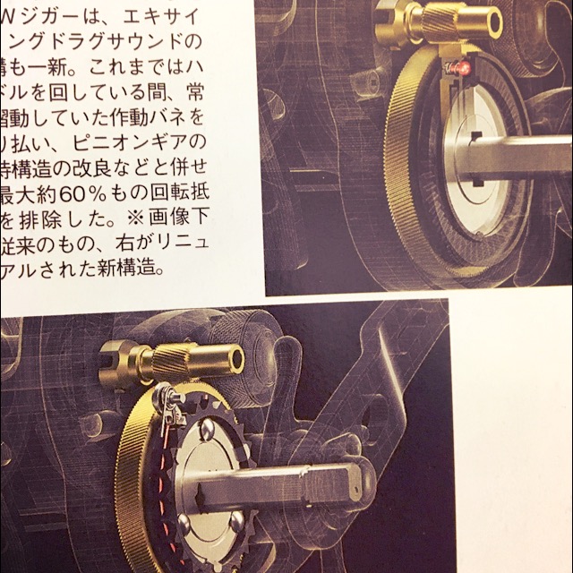 従来のドラグサウンド発生機構は図下,音出しラチェットのギアがドライブギア円周方向に切ってあり,これによってドラグ音出しピンを弾く?ことによってドラグ音を発生させていました.この機構の場合,音出しラチェットギアの外周をドラグ音出しラチェットバネが常に摺動しています.これが抵抗になっているだろうから改善しようということです.なるほど!と思いましたが,大した効果は無いと思います(笑.徹底ぶりに笑ってしまった次第です.そこまでやるか!って感じです.