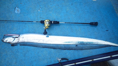 船長が「デカイですか?」と聞かれたので,「いや,デカくないです!タチっぽいです」と答えて上がってきたのは手のひらサイズ(指5本)のタチウオ!