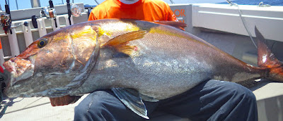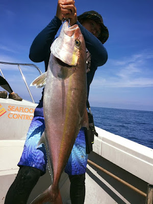 2人かがりで船にやっとこ上がったのは48kgの超ビックカンパチでした!