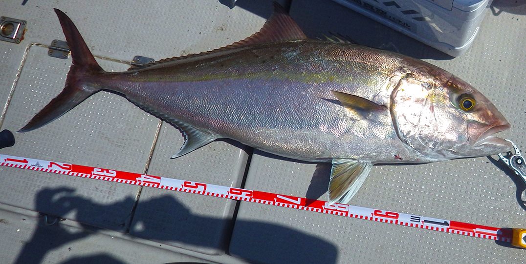 ファイトタイム40分を制して上がってきた魚体は巨大なカンパチ!