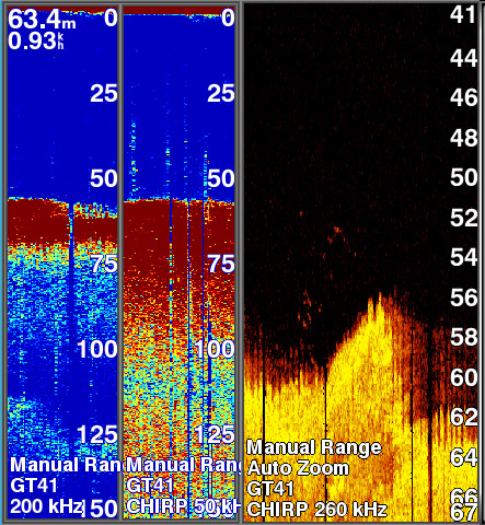 ClearVuについて簡単に説明しておくと,通常魚探では使わない「高周波帯域の魚探」ということになります.使われる周波数帯は260kHz,455kHz,800kHzっていう周波数帯になります.