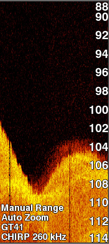 ちょっとボケた画像ですが,120mラインのかけあがりの中に,小さな段々がある場所です.こういうところも根魚が付きやすい瀬なんですよね〜.こういう情報も200kHzのオビキの変化からも読み取れる反面,クリアビューならよくわかります.