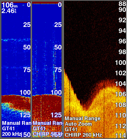 GARMINの260kHzのClearVuは250mまでは映ることを私の実機で確認しています.