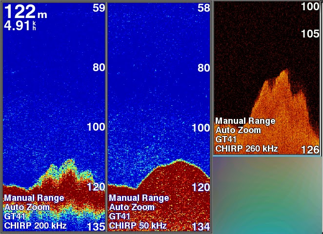 LOWRANCEのダウンビューでは455kHzしかなく,パワーもなかったので,90mぐらいまでしか高解像度イメージングできなかったのが,GARMINのClearVuなら100mオーバーもラクラクです.