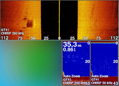 通常魚探は200kHzのほうが50kHzより映る範囲が狭いので,50kHzには魚群が写ってますが,200kHzの魚探にはちょっとだけしか写ってません.こういう反応のときは魚群の中心が船からちょっとズレている時に起きますが,これをみて魚群はどっちにいるか分かりますか?