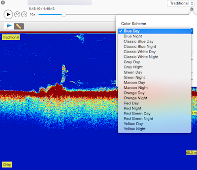 ちなみに,魚探画面の色合いを変えたければ,歯車マークのところから好きなカラースキームを選ぶことが出来ます.