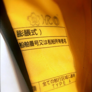 船釣りでは膨張式のライフジャケットを着用することが多いと思いますが,その場合は大抵,中の黄色い浮力体にマークがあります.