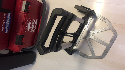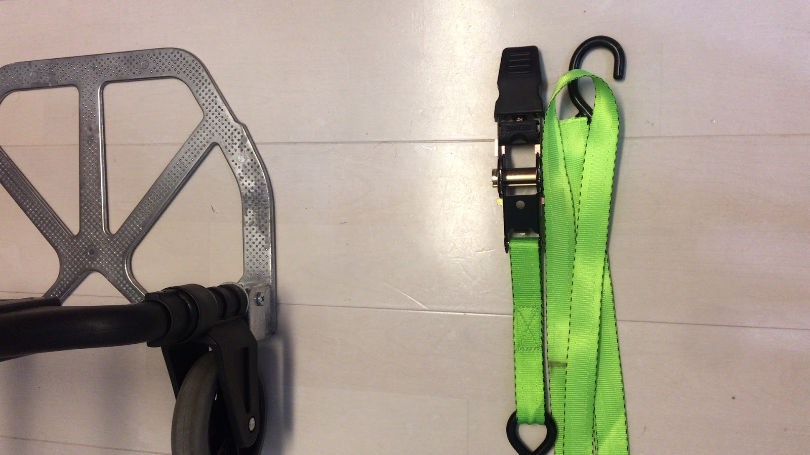 キャリーにドカットとリールケースを乗せて,ラチェット式の荷紐で強固に固定します.