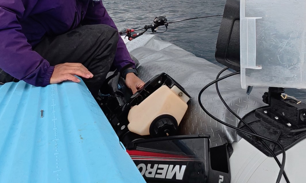 穴が空いた原因はこれは不明だったのですが,その日,現場について,いざゴムボを膨らませて出船しようとするとプシューという空気漏れ音が.